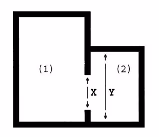 Als de lengte van de doorgang (X) breder is dan 50% van de lengte van Y, dan zijn ruimten 1 en 2 samen één vertrek of overige ruimte. |